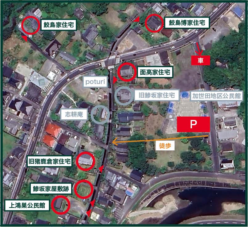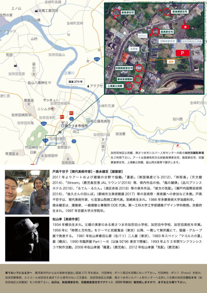 2025.11.12 会場の拡大地図です。赤丸(有料エリア)と益山用水ににアートが展示されます。上鴻巣公民館ではアートでなく加世田の古写真が展示されておりますので是非御覧ください。旧鯵坂家住宅は南さつま市の所有で無料で外部の見学が9〜16時の間、可能となっています。なお志耕庵では江戸時代から伝わる刀鍛冶による和釘の制作体験ができます。[志耕庵制作体験 23,24日9:30〜16:00、25日12:30〜16:00、30日9:30〜16:00]