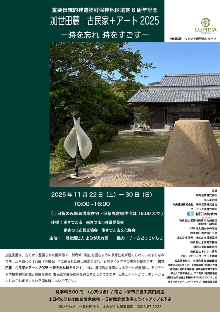 2025.11.11 2025年11月22日(土)〜30日(日)まで重要伝統的建造物群保存地区選定6周年記念 加世田麓 古民家+アート2025 ー時を忘れ、時をすごすーが開催されます。瀬戸内芸術祭にも出展された戸高千世子さん等の揺らぐアートと砂像の空間体験ができます。